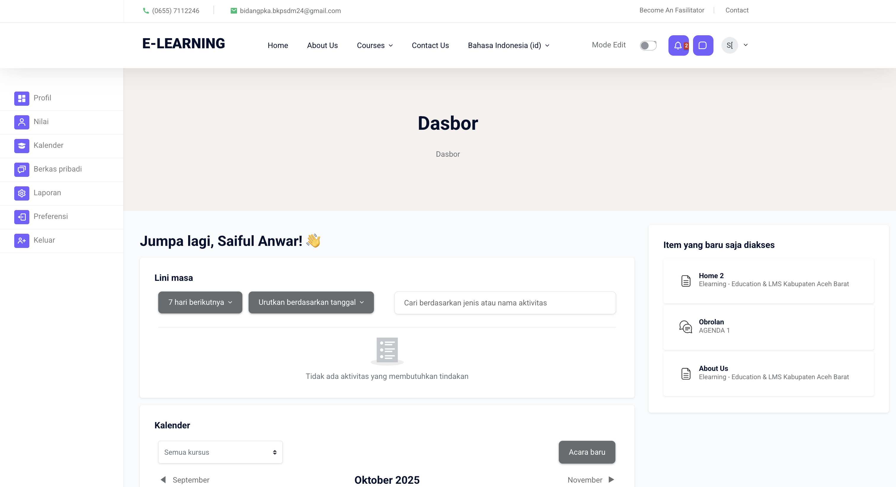 (Gambar 3: Dashboar Elearning)