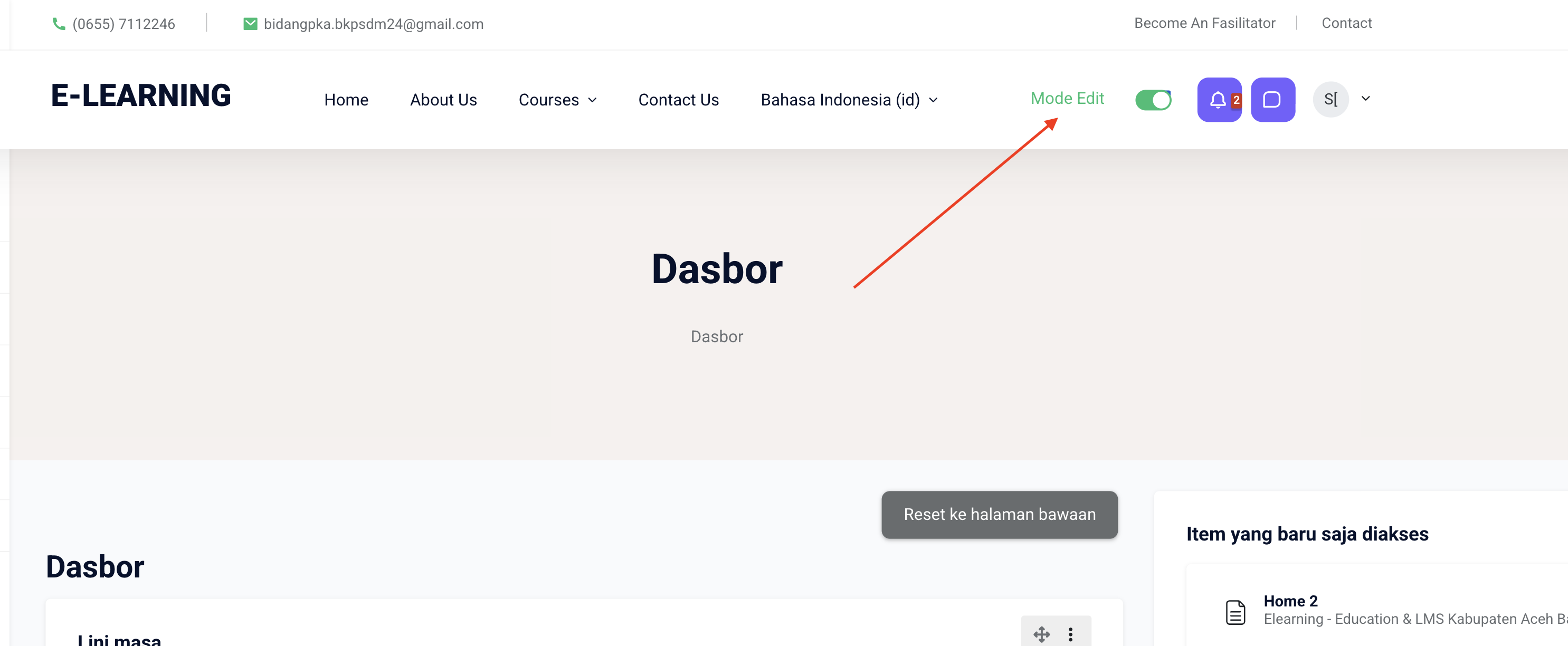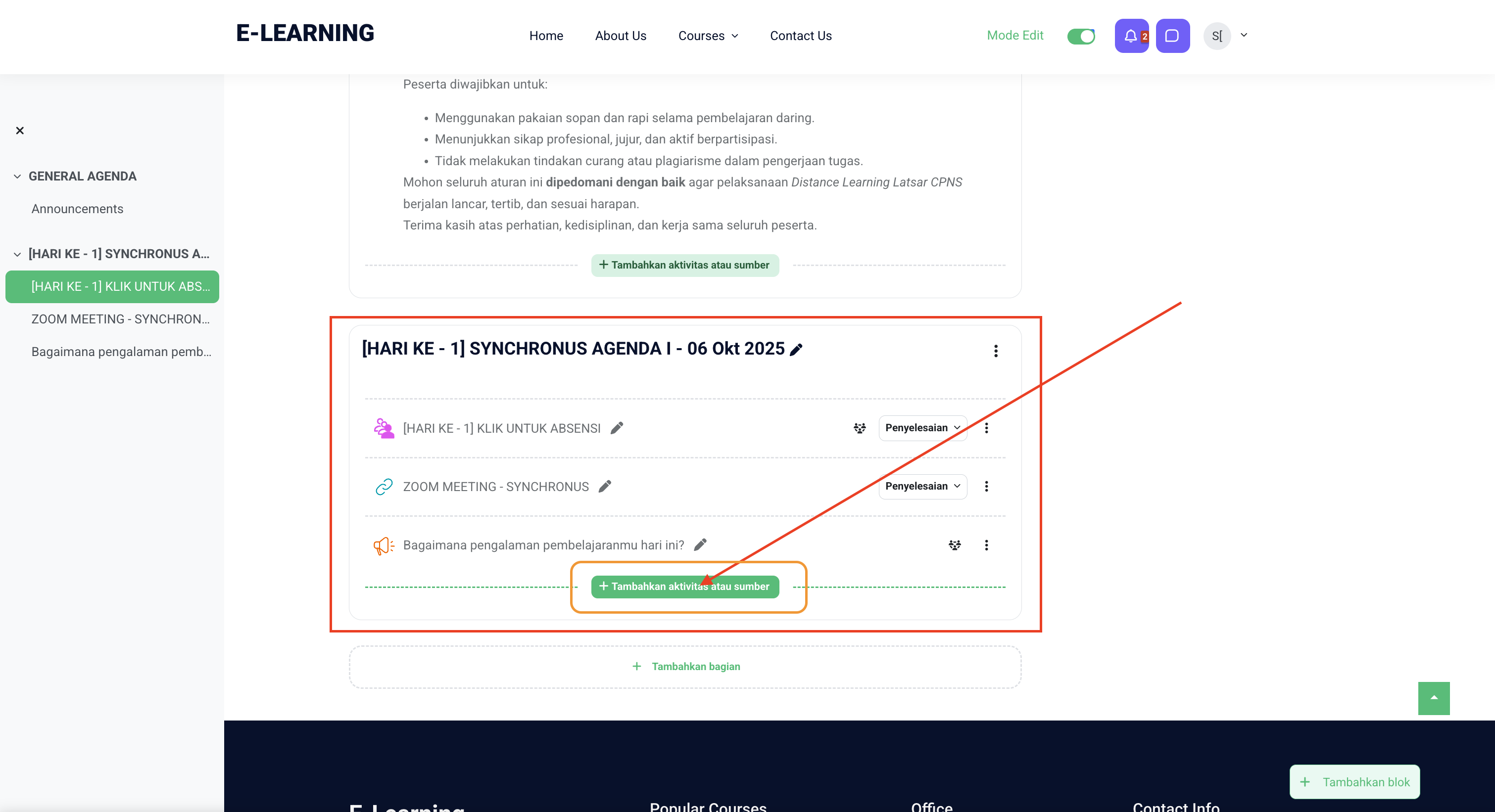 Di halaman dashboar, klik Turn editing on / Aktifkan mode edit (biasanya di kanan atas). pastikan setelah diklik di tulisan "Mode Edit"  tombolnya berubah warna menjadi hijau
