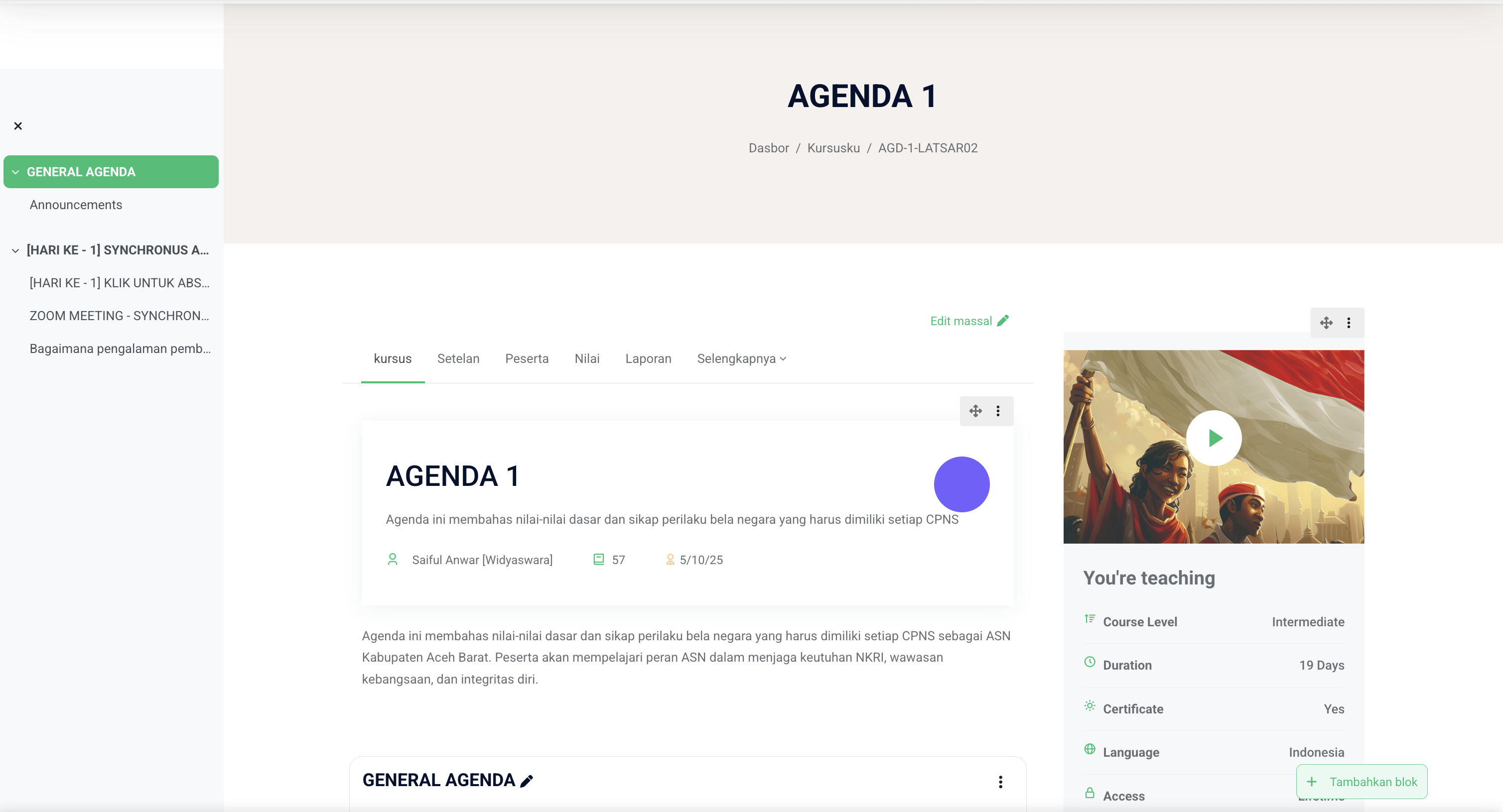 Di dalam tampilan tersebut akan muncul beberapa agenda kursus seperti: