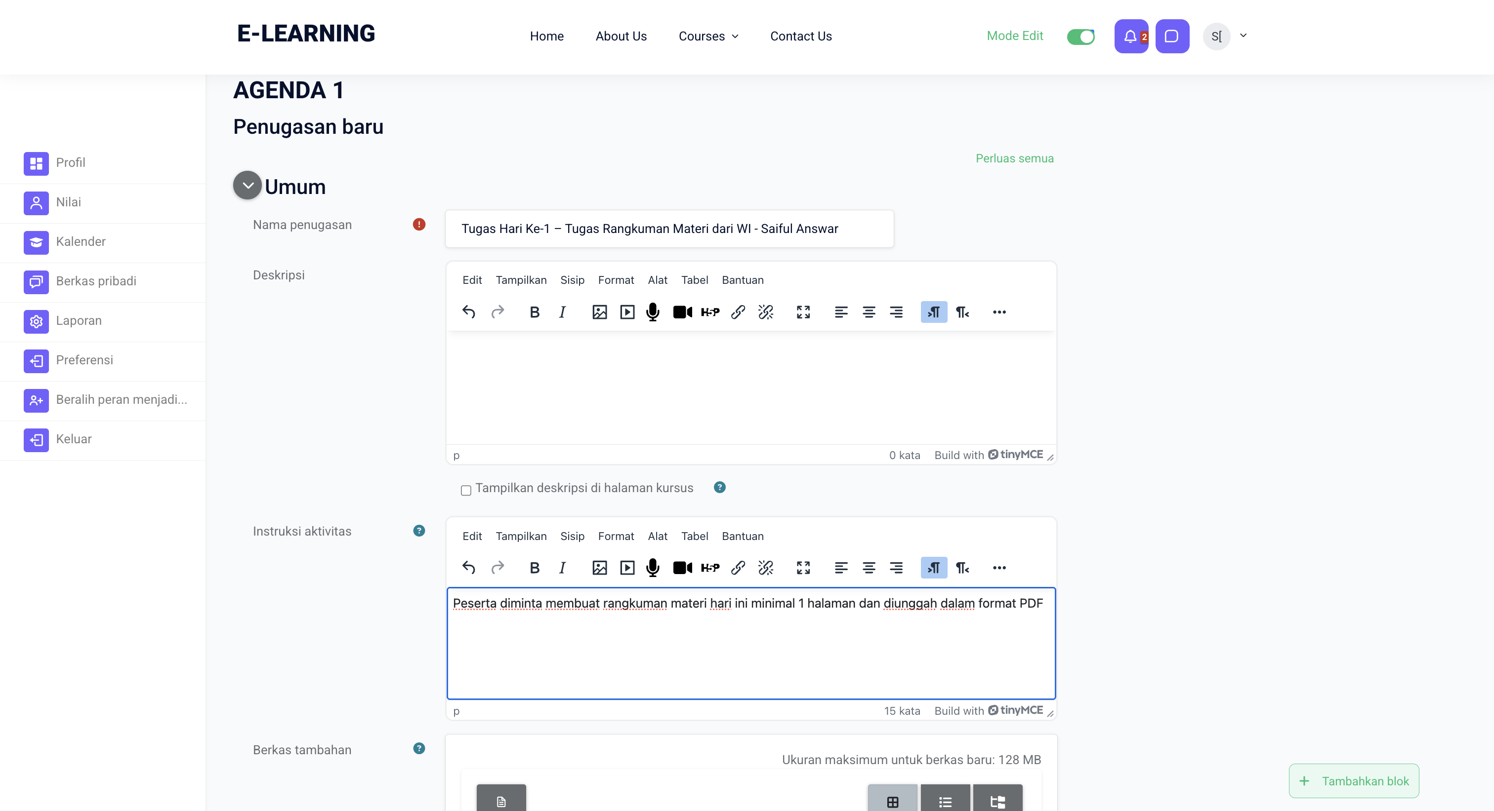 (Gambar : Menu tugas sudah terlihat di Course Agenda 1