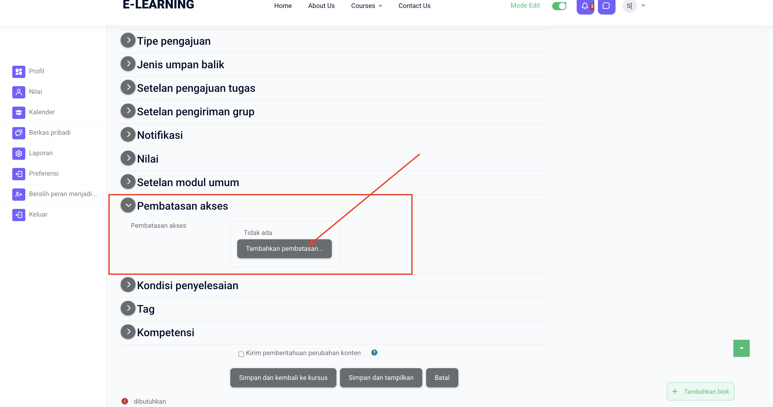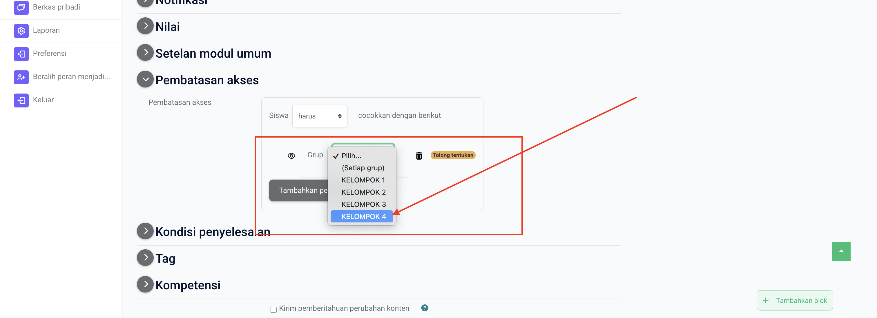 • Ketika “Pembatasan akses → Tambahkan pembatasan → Grup” dipilih, Anda bisa menentukan kelompok mana yang boleh melihat atau mengerjakan tugas tersebut.